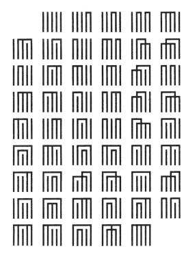 52 Diagramme aus dem Roman "Die Geschichte des Prinzen Genji" der Japanerin Murasaki Schikibu (etwa 978 bis 1031), die dort die Anfänge der Kapitel 2 bis 53 markieren. In der Reihenfolge der Diagramme wurde bis heute keine Gesetzmäßigkeit gefunden. |